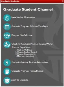 The Graduate Channel was created for all graduate students to have access to all links that are required for them to be successful. It will appear in a dark gray box at the top of your portal during your first term of enrollment at Western Oregon University. If you have started classes and still do not have the channel, please contact Amber Deets right away.